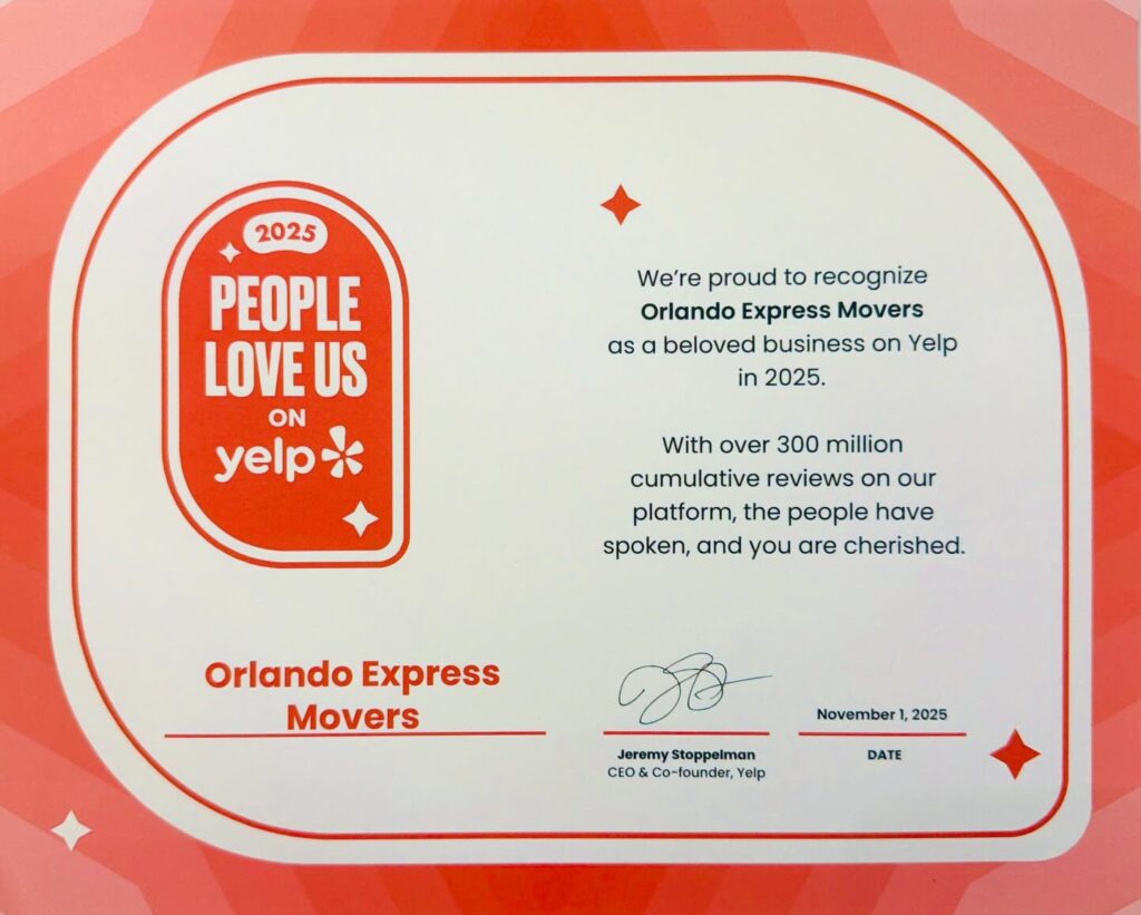 Our 2025 “People Love Us on Yelp” award proves hundreds of Orlando families trusted us with their moves and loved the results. You get movers with a track record of careful handling, on-time arrivals, and truly stress-free experiences.